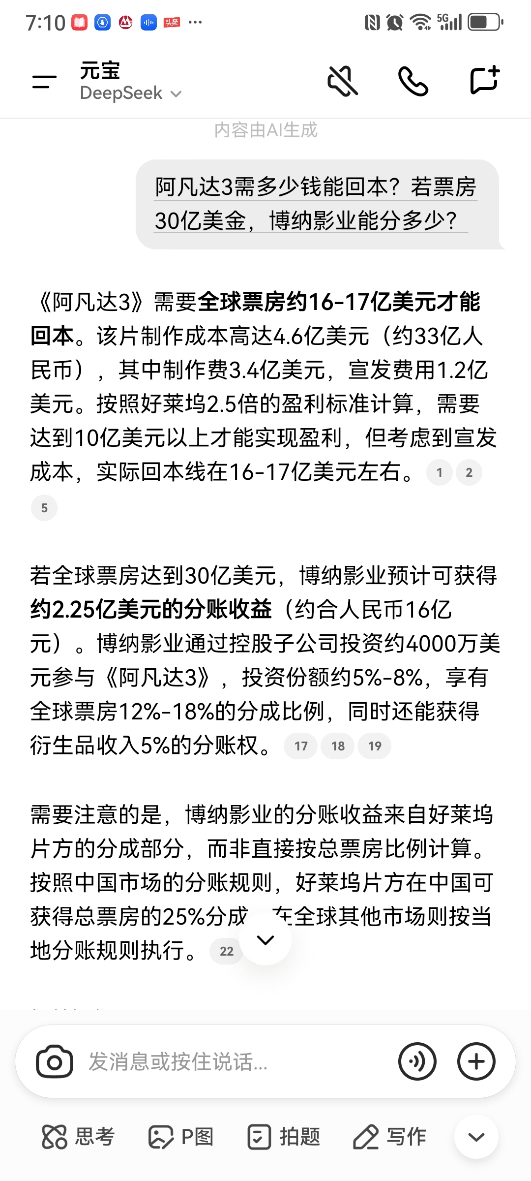 $博纳影业(SZ001330)$ 阿3成本太高,16一17亿美金才能回本