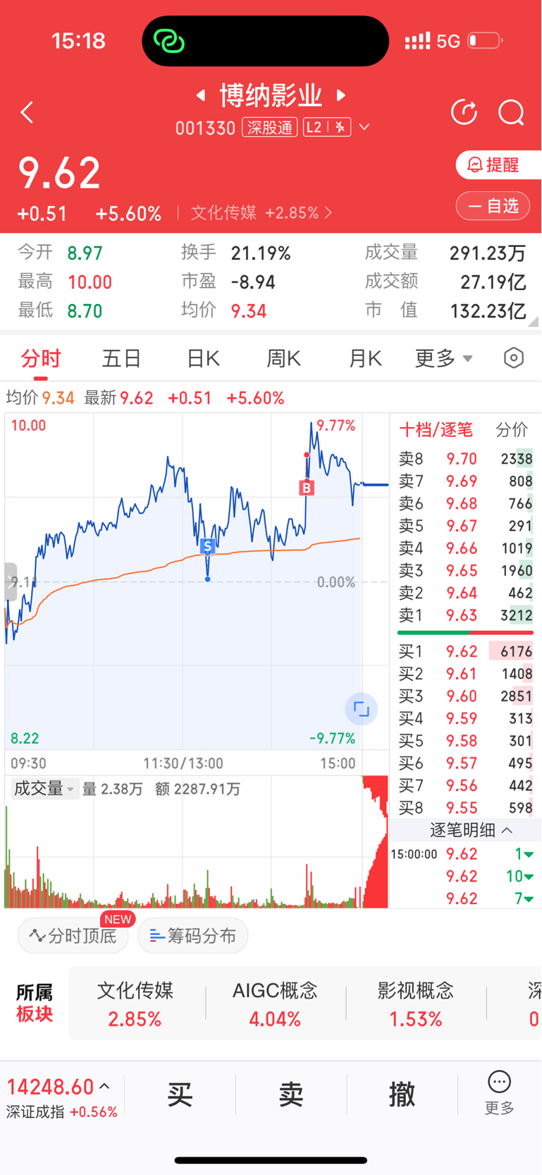 $博纳影业(SZ001330)$ 做了个反T,涨5个点没赚钱,还亏了手续费,专业陪跑,太惨了。