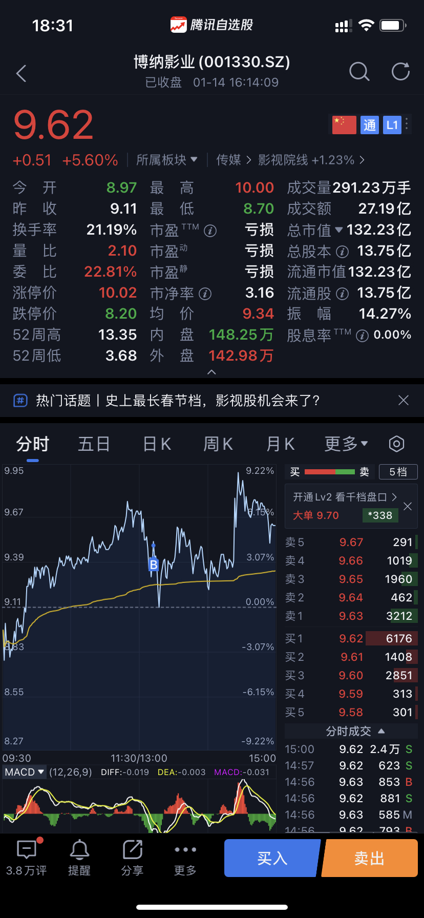 $博纳影业(SZ001330)$ 今天两融提高杠杆比例引发大盘跳水,博纳也就是被量化带下来的而已,下午依旧冲击涨停,典型属于错杀!博纳没有融资盘,这几天的涨幅都是真金白银堆出来的,今天这波下杀洗出了大部分散户才造成的高换手。明天拭目以待!立贴为证!