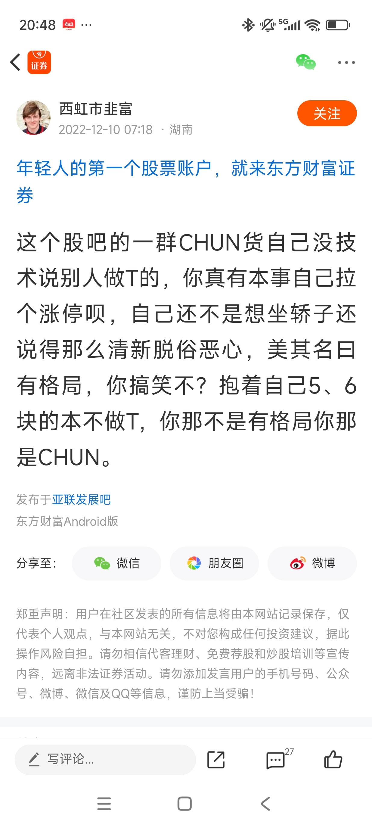 温馨提示: 1.根据《证券法》规定,禁止编造、传播虚假信息或者误导性信息,扰乱证券市场;2.用户在本社区发表的所有资料、言论等仅代表个人观点,与本网站立场无关,不对您构成任何投资建议。用户应基于自己的独立判断,自行决定证券投资并承担相应风险。《东方财富社区管理规定》