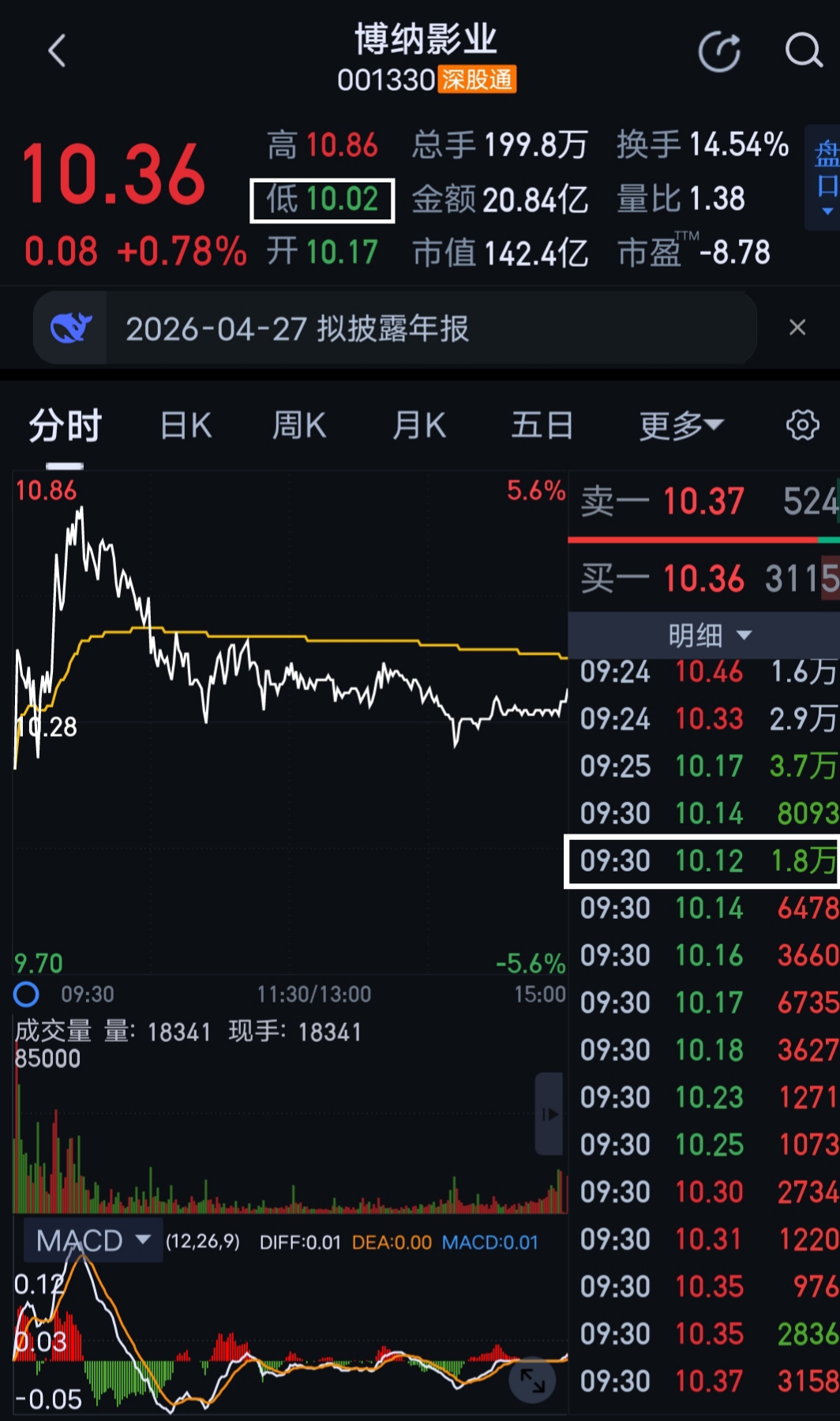 $博纳影业(SZ001330)$ 今天10.02什么意思,是不是有人10.02买没人10.02买?就是10.02卖的10.12最低成交了