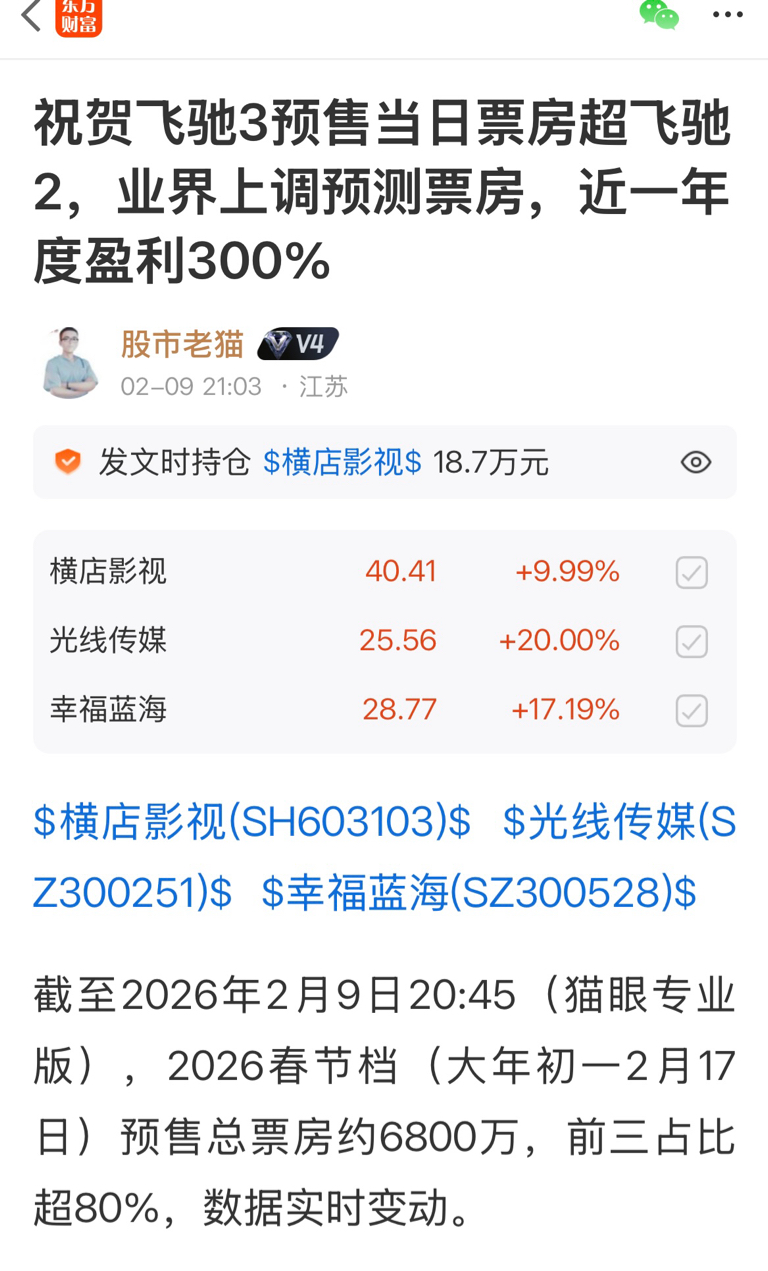 关注我上车《飞驰人生3》关联股的兄弟们,昨晚发帖《飞驰人生3》预售超《飞驰人生2