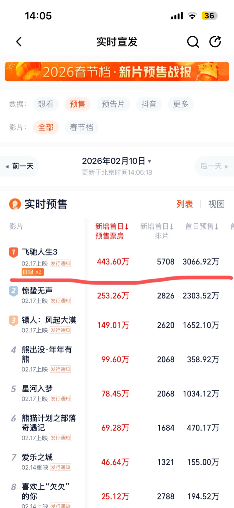 截止2月10日下午14点,《飞驰人生3》预售票房3066万元,二日连冠,持股的兄弟们记得买张电影票