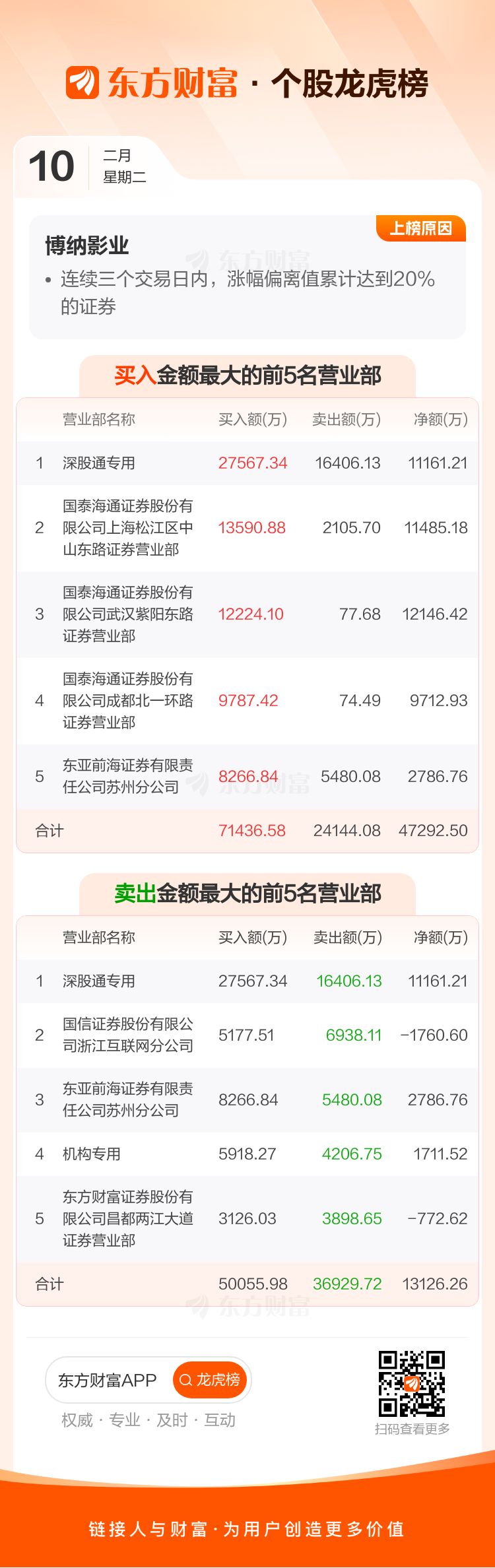 交易所2026年2月10日公布的交易公开信息显示,博纳影业因成为连续三个交易日内,涨幅偏离值累计达到20%的证券上榜。博纳影业当日收报12.47元,涨跌幅9.96%,换手率6.10%,成交额10.22亿。异常期间2月6日至2月10日,期间涨幅23.71%,累计偏离值21.78%,区间成交额48.87亿。
