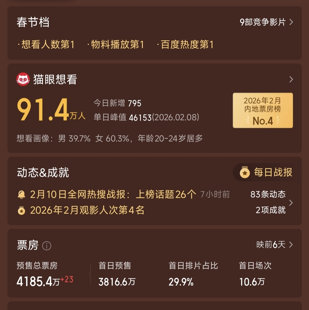 $博纳影业(SZ001330)$ 电影飞驰人生3预售第三天今天破5千万,想看人数91万摇摇领先第第二名电影惊蛰无声。大家继续买票支持电影飞驰人生3。主力二个涨停今天继续涨停大家记得感恩主力。豆瓣评分记得给五星好评