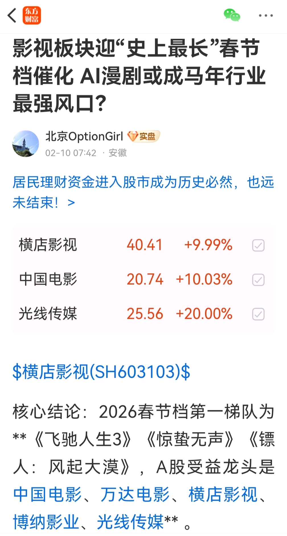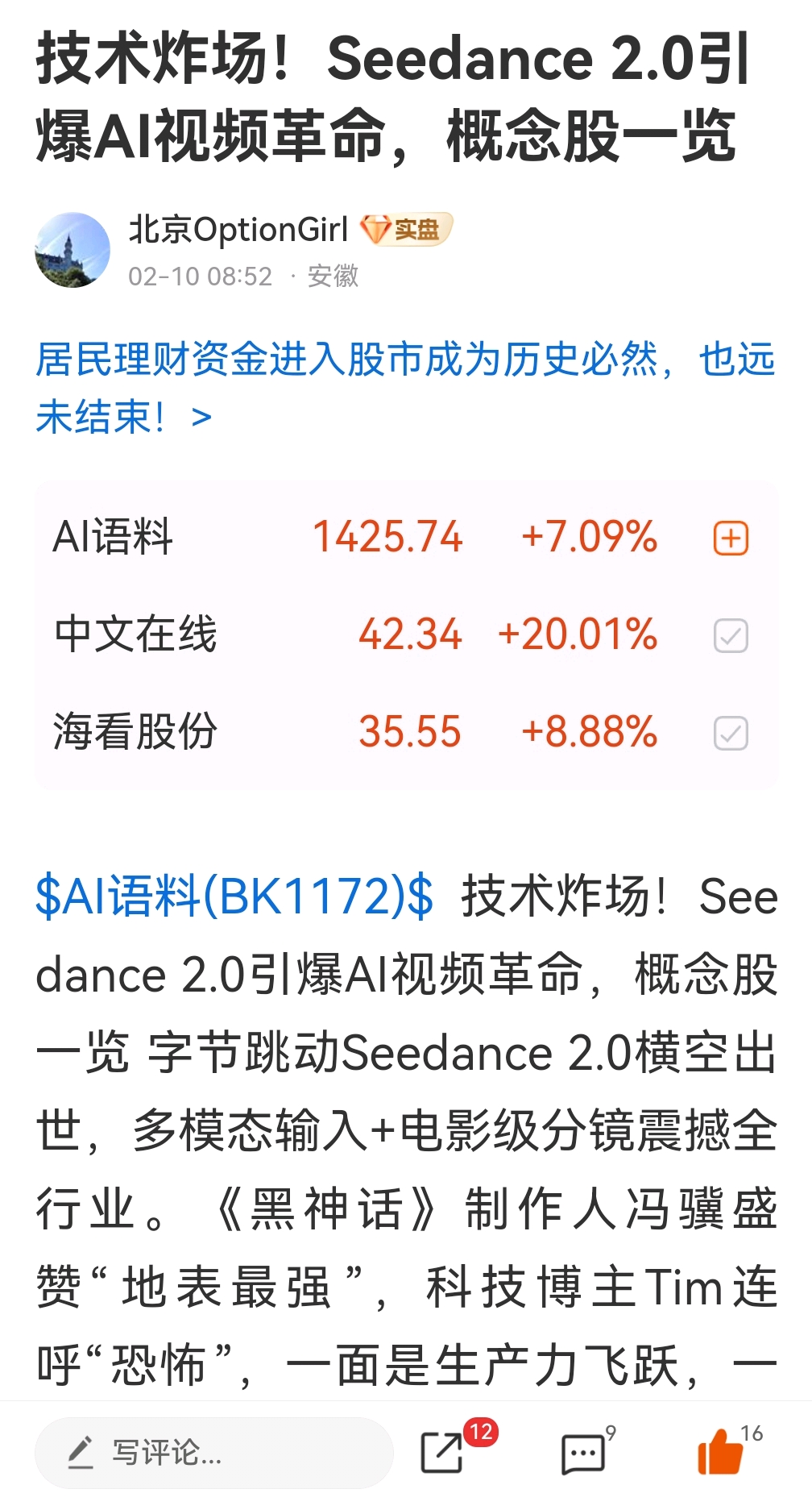 以上帖子只作交流探讨,不构成投资建议。股市风险莫测,买卖须谨慎。#Seedance 2.0爆火!AI应用或迎商业化拐点#  $光线传媒(SZ300251)$  $中文在线(SZ300364)$  $浙江医药(SH600216)$  #机构强推光纤、CPO:云厂商资本开支强劲#