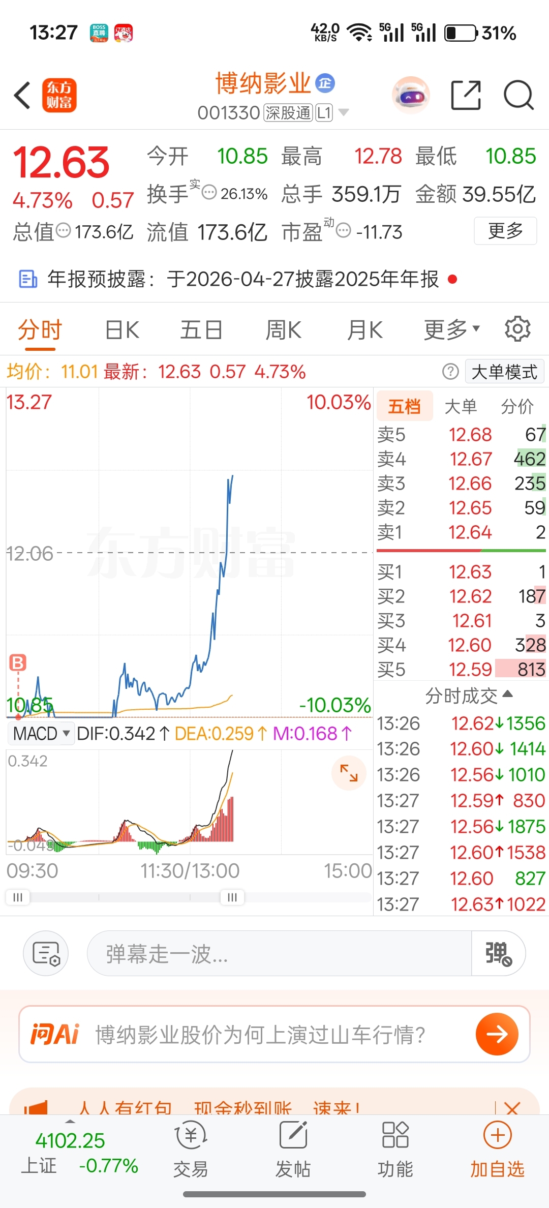 $博纳影业(SZ001330)$ 能吃地天吗???