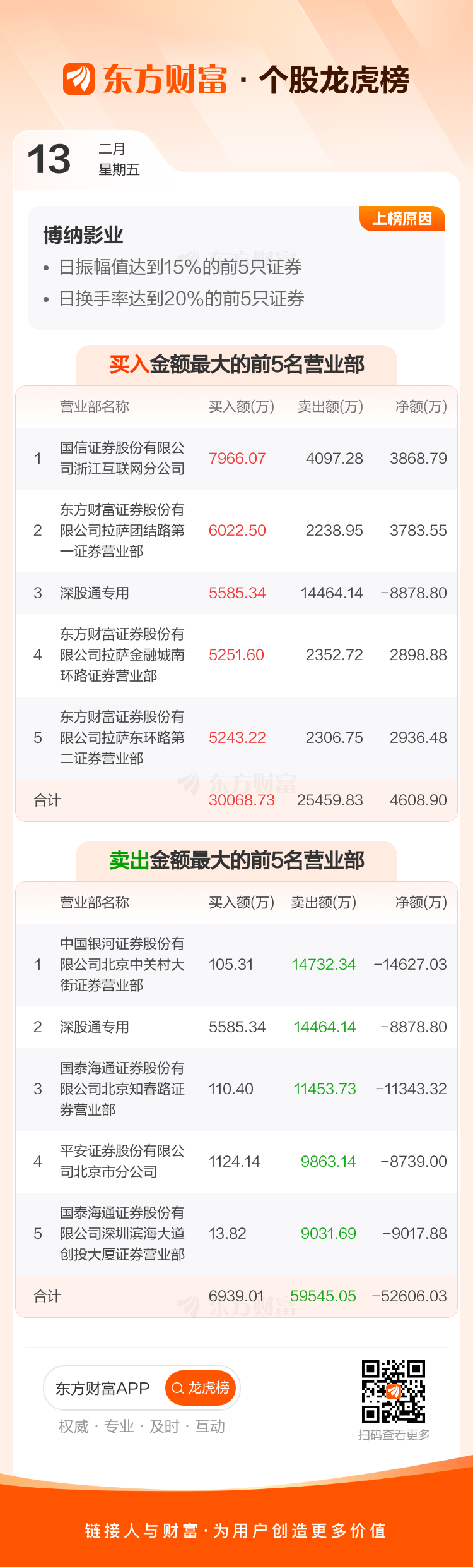 交易所2026年2月13日公布的交易公开信息显示,博纳影业因成为日振幅值达到15%的前5只证券、日换手率达到20%的前5只证券上榜。博纳影业当日收报12.77元,涨跌幅5.89%,偏离值20.46%,换手率30.66%,成交额47.47亿。