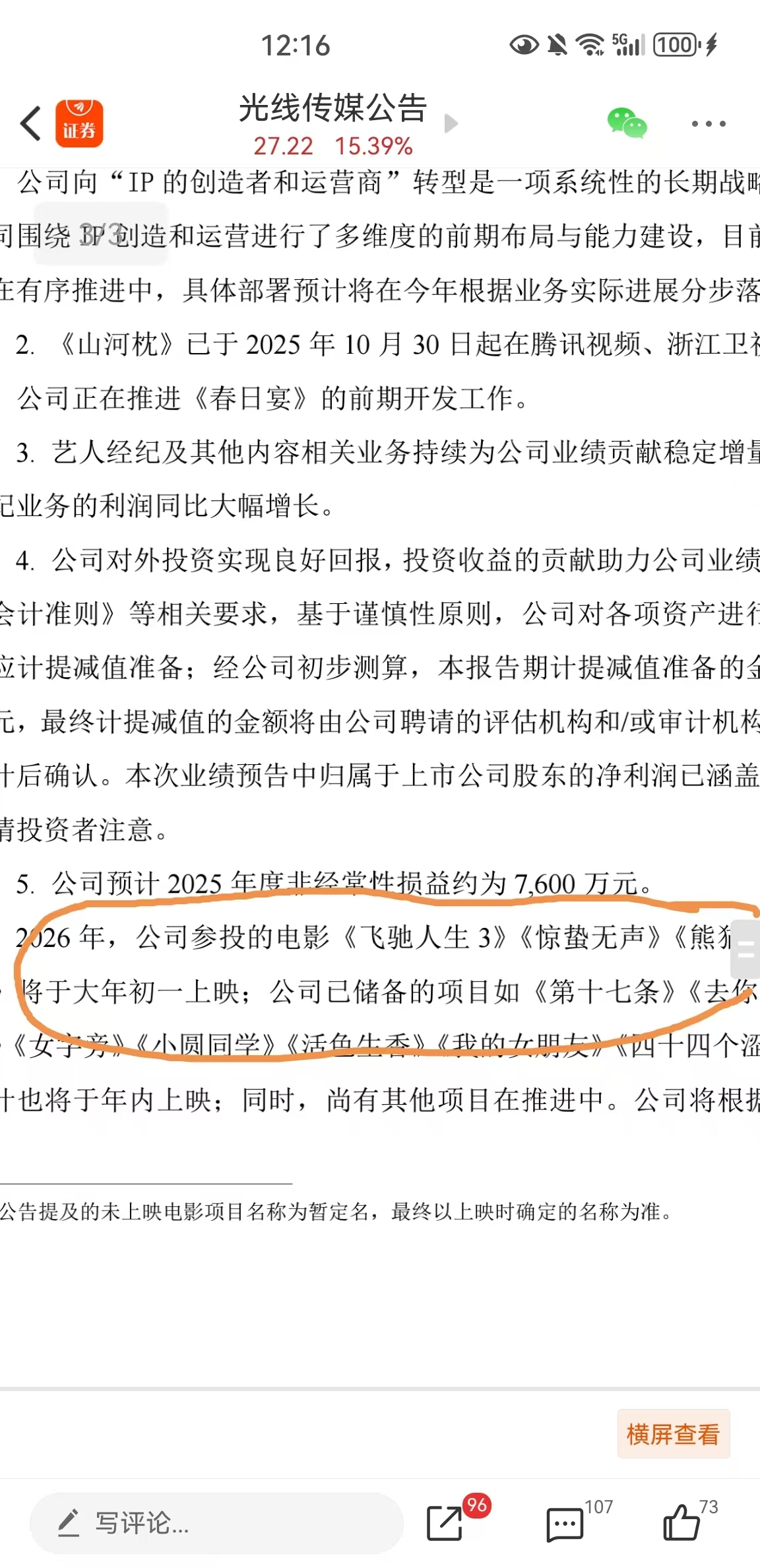 $博纳影业(SZ001330)$ 光线传媒投资飞驰人生3排名第一