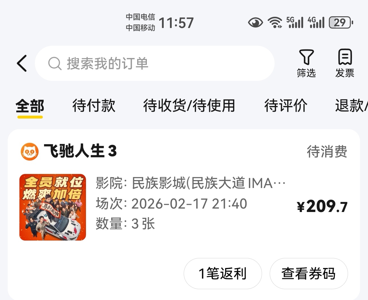 小散我买3张票看飞3,千言万语不如买票支持