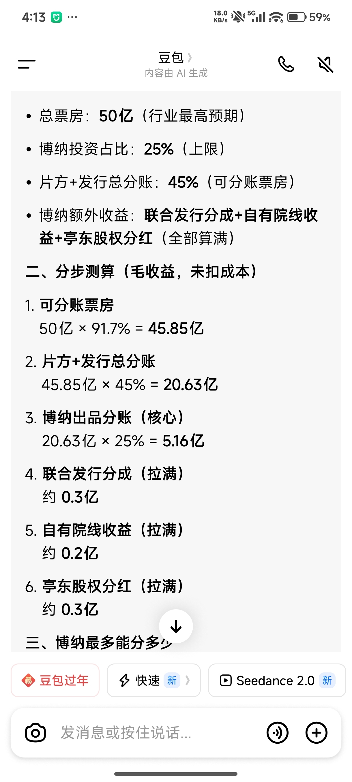 $博纳影业(SZ001330)$ 所有受益都算上博纳预期收益还是比较高的:投资占比24%,博纳还有亭东10%股权,加自有院线。乐观看50亿票房(完全有可能),博纳单片收益可能有5/6亿元。单片可能扭转博纳颓势,这个片子目前是博纳的支柱。