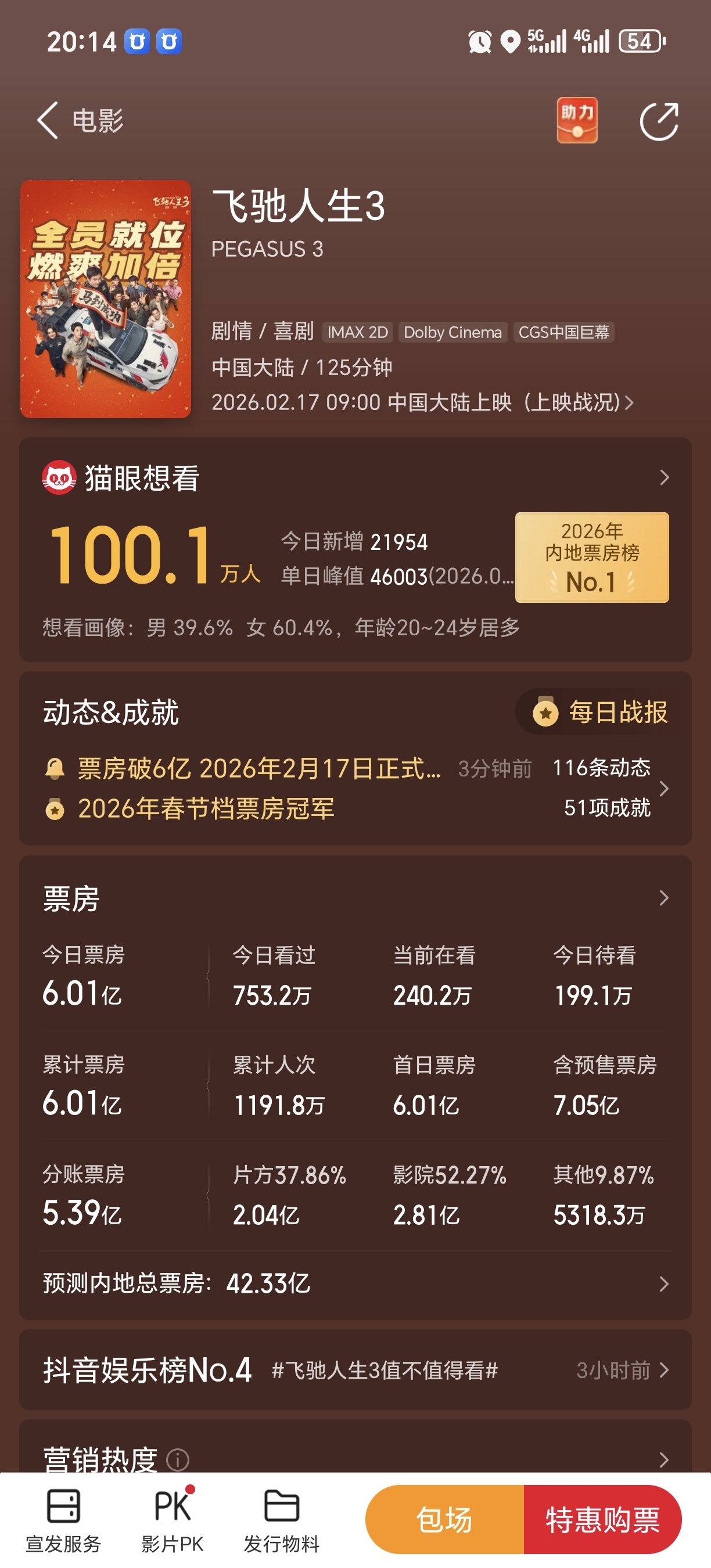 原本通过数据预测的首日票房5.4亿,总42亿。今天可能突破7.5亿,评分上去了,