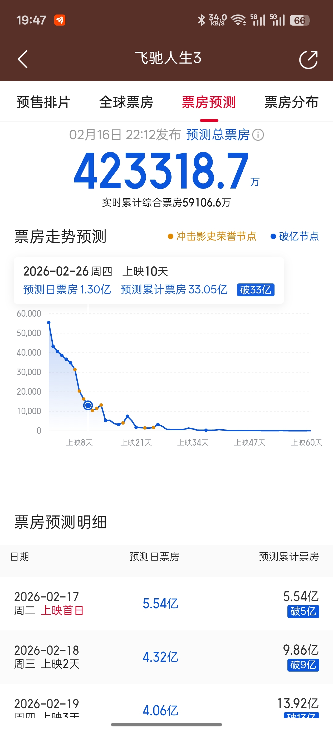 猫眼之前对飞驰人生3预计的42亿票房,2/17日上映首日预计的单日票房是5.54