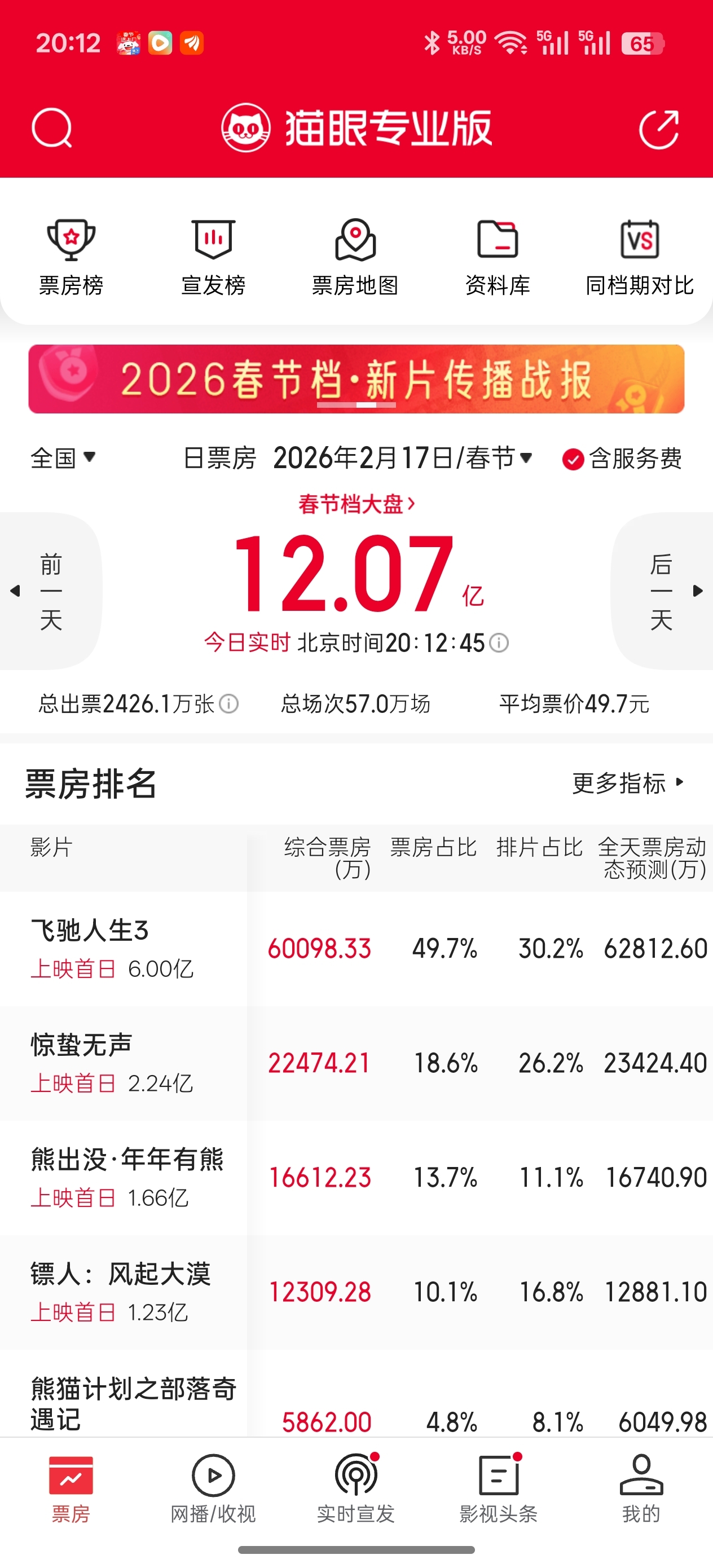 $博纳影业(SZ001330)$ 猫眼之前对飞驰人生3预计的42亿票房,2/17日上映首日预计的单日票房是5.54亿,而截止晚8点,飞驰人生3的当日票房已经突破6亿。已经超出了预估的当日票房。那么预估票房很有可能突破预估的42亿元。