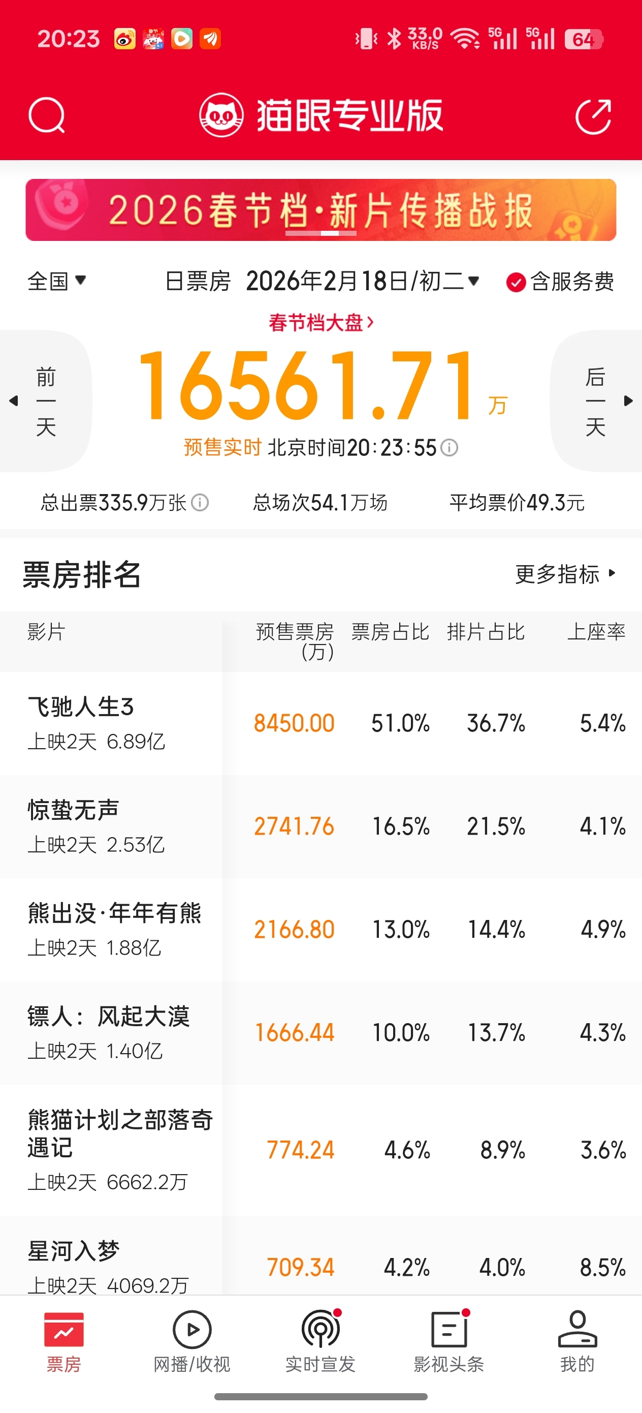 明天春节档影片排片占比变化:飞驰人生3:30%->36%,增加6%场次惊蛰无声: