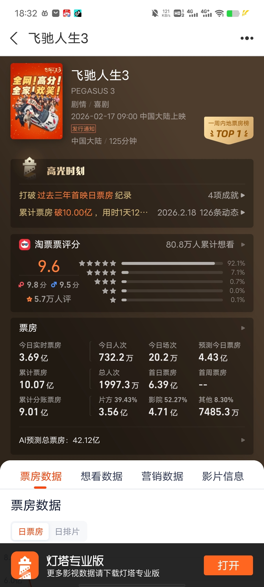 $博纳影业(SZ001330)$ 恭喜飞驰人生3第二天票房破10亿,再接再厉,下周开盘前突破30亿应该是稳了