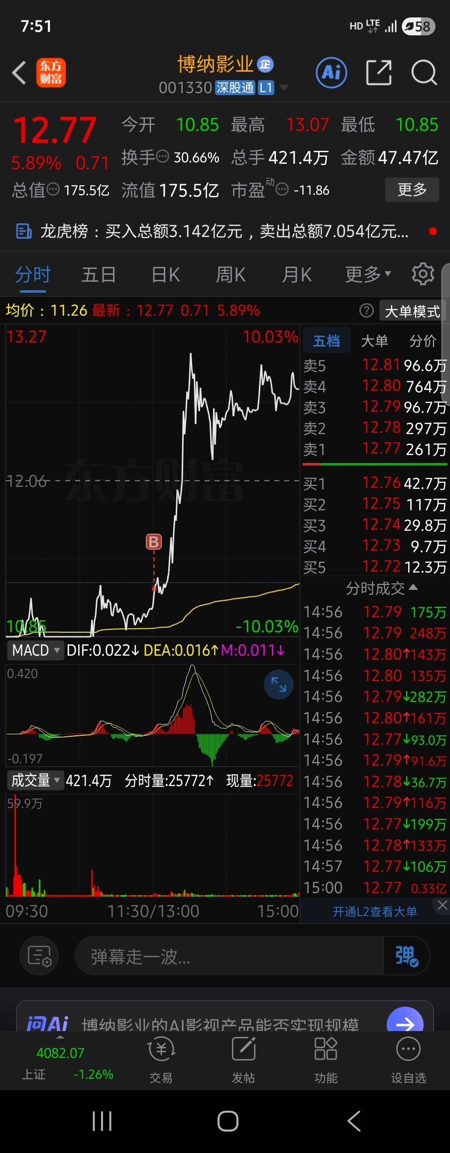$博纳影业(SZ001330)$ 当天吃了13个点开盘在赚点就跑,虽然能赚个几万,但是没意思,这票基本面太次了而且电影真心不好看,情绪最终会回归现实,不跑必定会吃面
