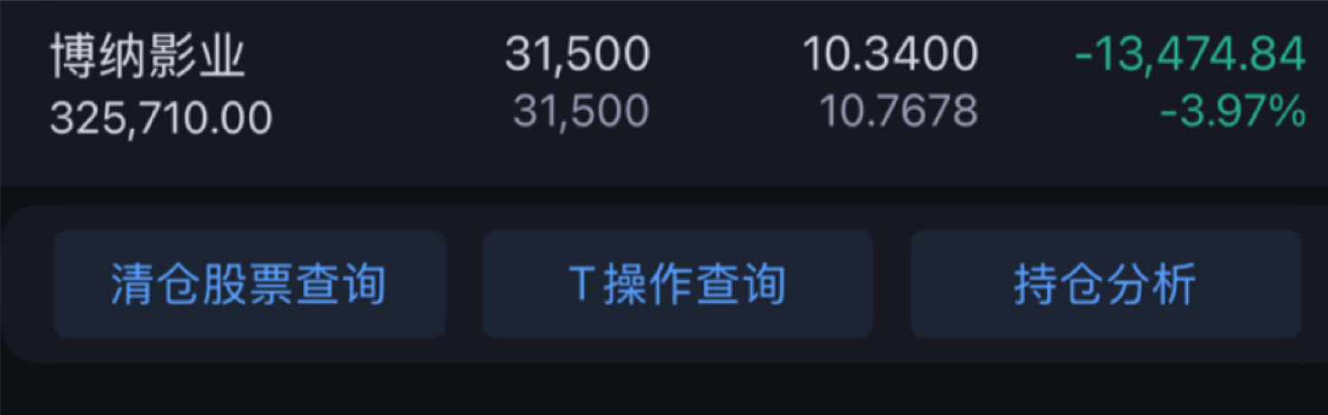 $博纳影业(SZ001330)$ 说实话,也持股3万股在里面,当时浮盈了16个点,今天早上补仓了1万股想着赌一下反弹,再T回来一点不亏那么多,但后面被封死,晚上复盘还是上头了,感觉明天还要跌个3-4个点,没办法了,没筹码了,愿赌服输,再积累经验吧,早点睡觉了