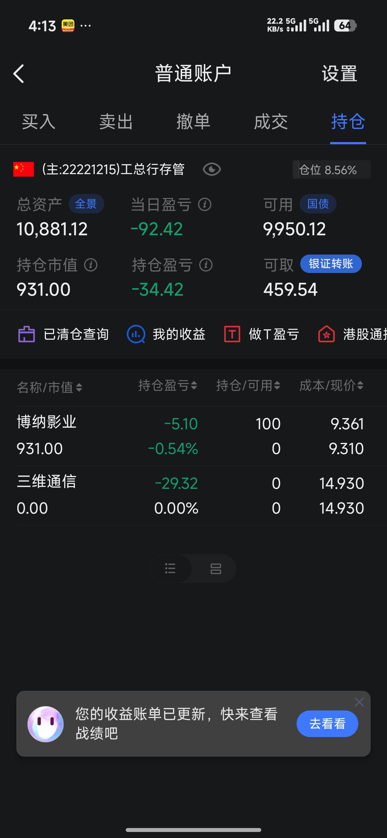 卖了三维通信买入100股博纳影业,看明天怎么走吧,1万炒股希望能赚钱