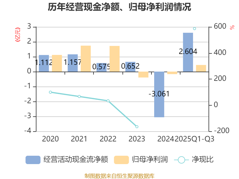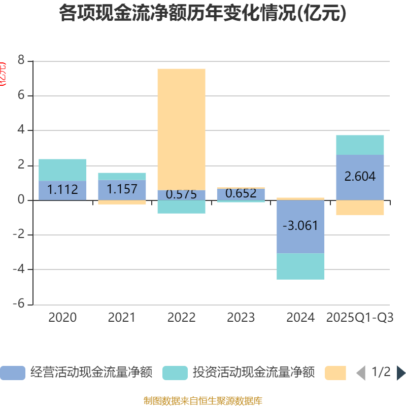 2025年前三季度,公司经营活动现金流净额为2.6亿元,同比增加5.24亿元;筹资活动现金流净额-8624.27万元,同比减少1.46亿元;投资活动现金流净额1.13亿元,上年同期为-2.35亿元。
