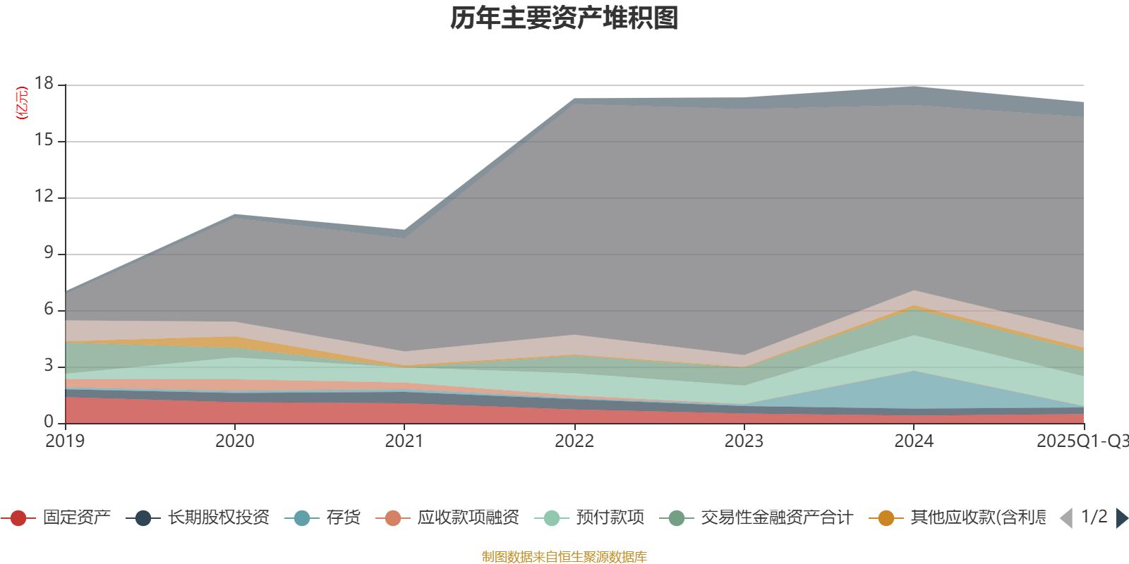资产重大变化方面,截至2025年三季度末,公司货币资金较上年末增加15.43%,占公司总资产比重上升11.64个百分点;存货较上年末减少96.66%,占公司总资产比重下降10.82个百分点;预付款项较上年末减少16.4%,占公司总资产比重下降1.3个百分点;其他非流动资产较上年末减少97.12%,占公司总资产比重下降1.21个百分点。