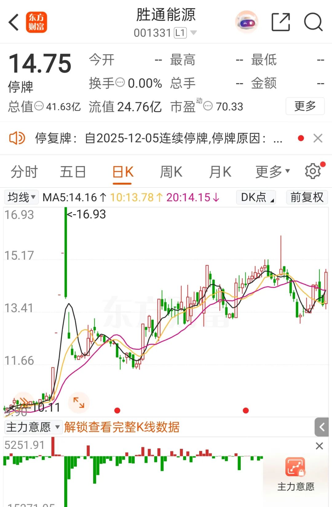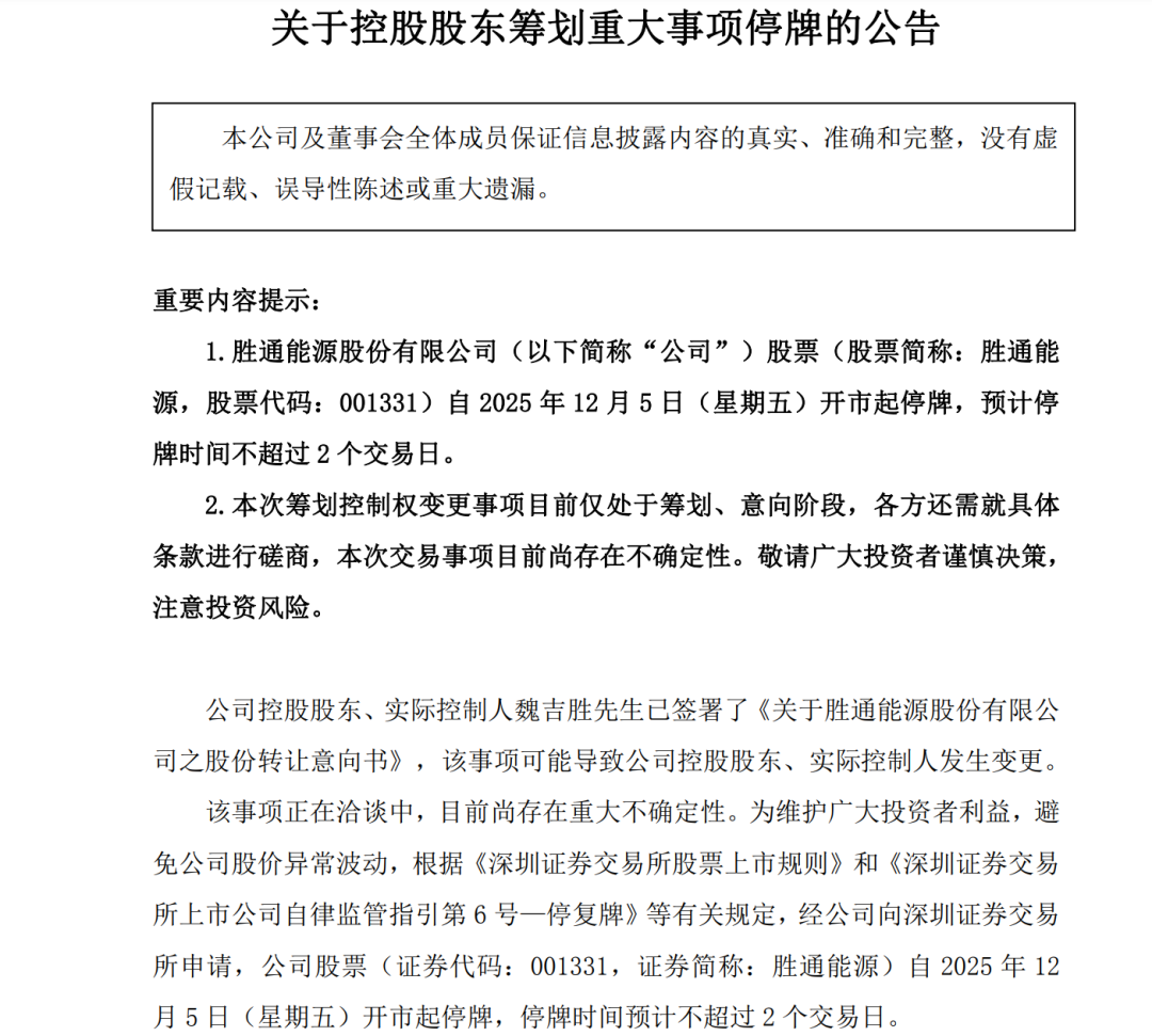 在12月5日开盘前,深交所已针对该事项发布了胜通能源股票临时停牌的公告。