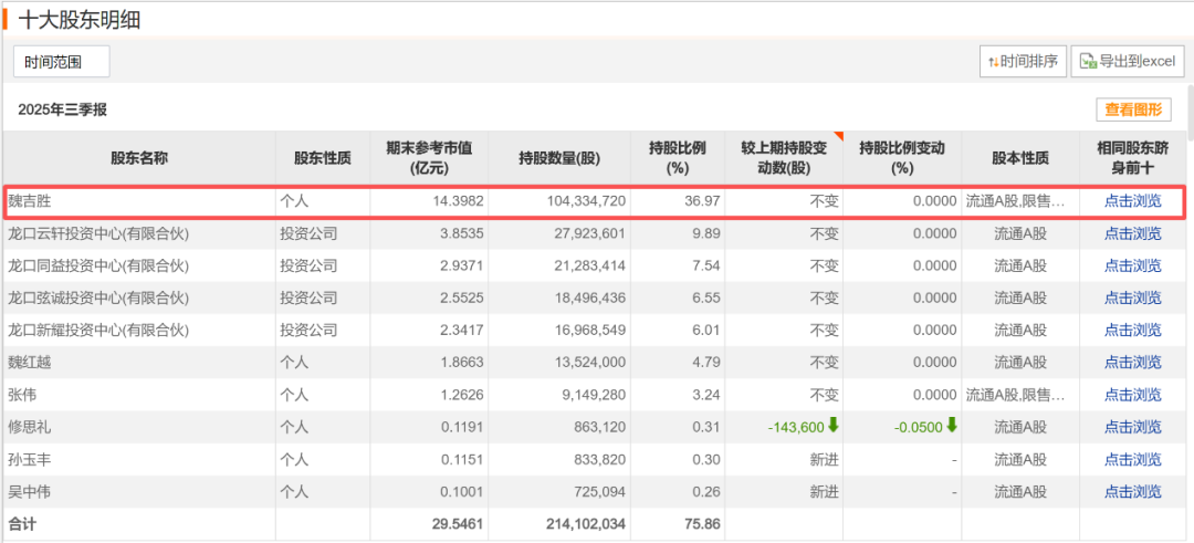 截至2025年三季度末,魏吉胜直接持有胜通能源1.04亿股,持股占比为36.97%,系公司第一大股东,期末参考市值约为14.4亿元。