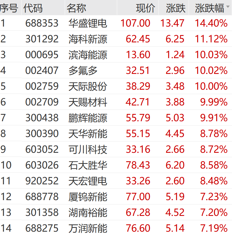 个股方面,滨海能源、多氟多、天际股份、天赐材料等多股涨停,华盛锂电、海科新源等涨超10%。