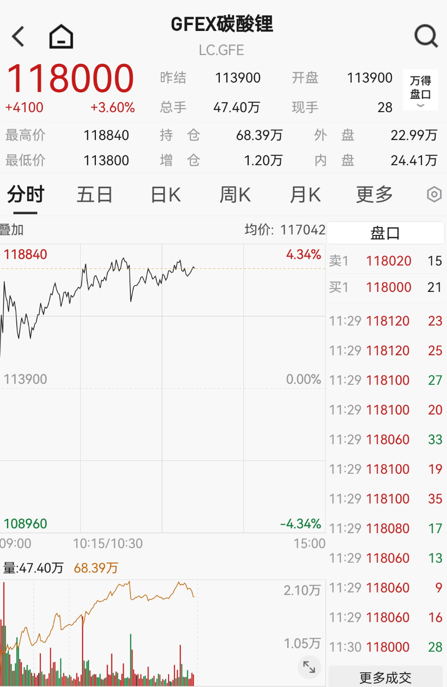 期货市场上,上午碳酸锂主力合约盘中涨超4%。
