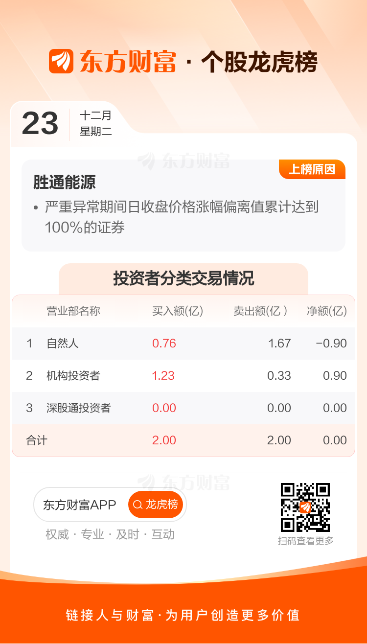 交易所2025年12月23日公布的交易公开信息显示,胜通能源因成为严重异常期间日收盘价格涨幅偏离值累计达到100%的证券上榜。胜通能源当日收报31.63元,涨跌幅10.02%,换手率1.61%,成交额8567.93万。严重异常期间12月12日至12月23日,期间涨幅114.44%,累计偏离值113.02%,区间成交额2.00亿。