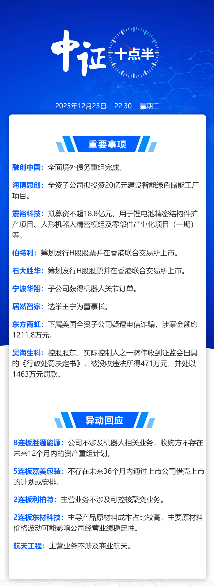 【中证十点半】8连板胜通能源回应异动;震裕科技拟募资18.8亿元用于人形机器人等项目