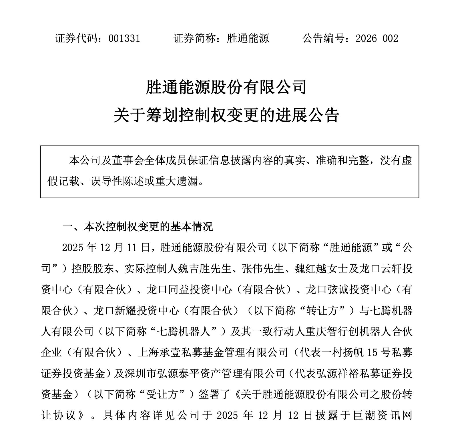 2025年12月11日,胜通能源披露重磅公告,重庆特种机器人企业七腾机器人有限公司(简称“七腾机器人”)拟通过“协议受让+部分要约收购”方式,合计斥资超16亿元持有胜通能源最多44.99%股份,成为控股股东。
