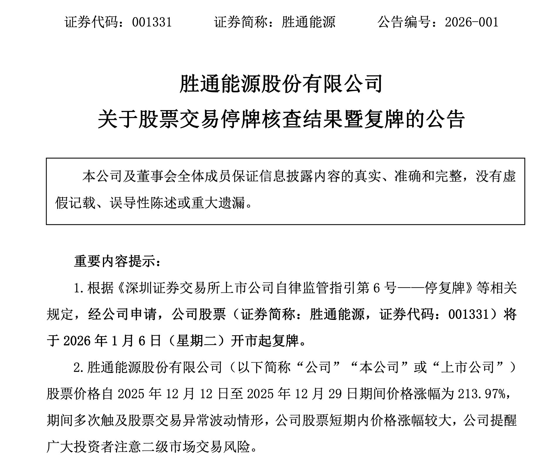 1月5日晚,胜通能源(001331.SZ)公告称,停牌期间,公司就股票交易波动情况进行了核查。鉴于相关核查工作已完成,根据相关规定,经公司申请,公司股票将于2026年1月6日(星期二)开市起复牌。公司股票自2025年12月12日至12月29日期间价格涨幅为213.97%,公司股票短期内价格涨幅较大。公司未发现近期公共传媒报道了可能或已经对公司股票交易价格产生较大影响的未公开重大信息。近期公司经营情况正常,不存在内外部经营环境、相关业务发生重大变化的情形。