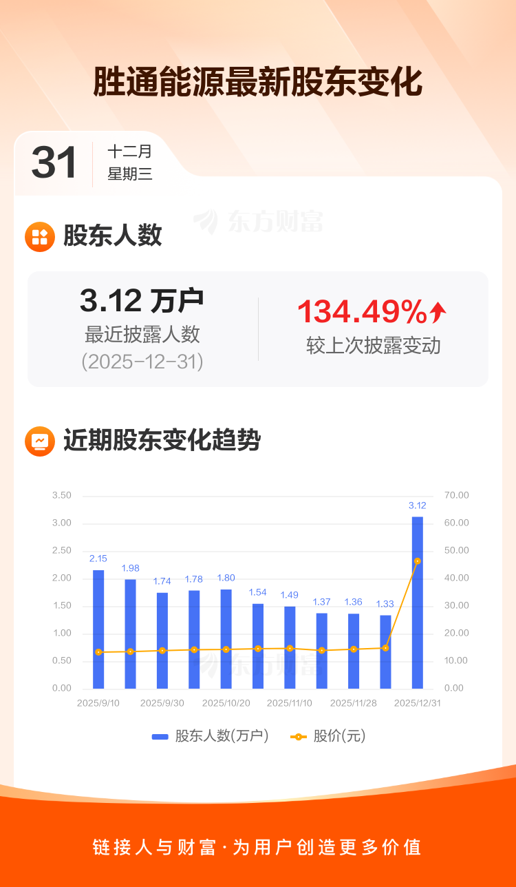 胜通能源:截至12月31日最新股东户数3.12万户,较上期增加134.49%