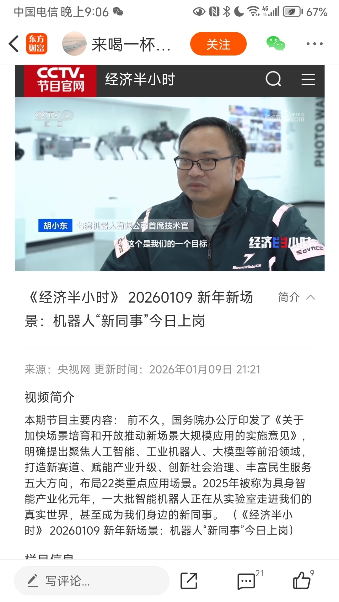 $胜通能源(SZ001331)$ CCTV2财经频道「经济半小时 20260109」,七腾机器人专题视频,产品销往20多个国家和地区:https://tv.cctv.cn/2026/01/09/VIDErPszNwePjU0PJtW6AwgL260109.shtml(视频中间部分12分40秒开始央视针对七腾机器人有详细报道)。