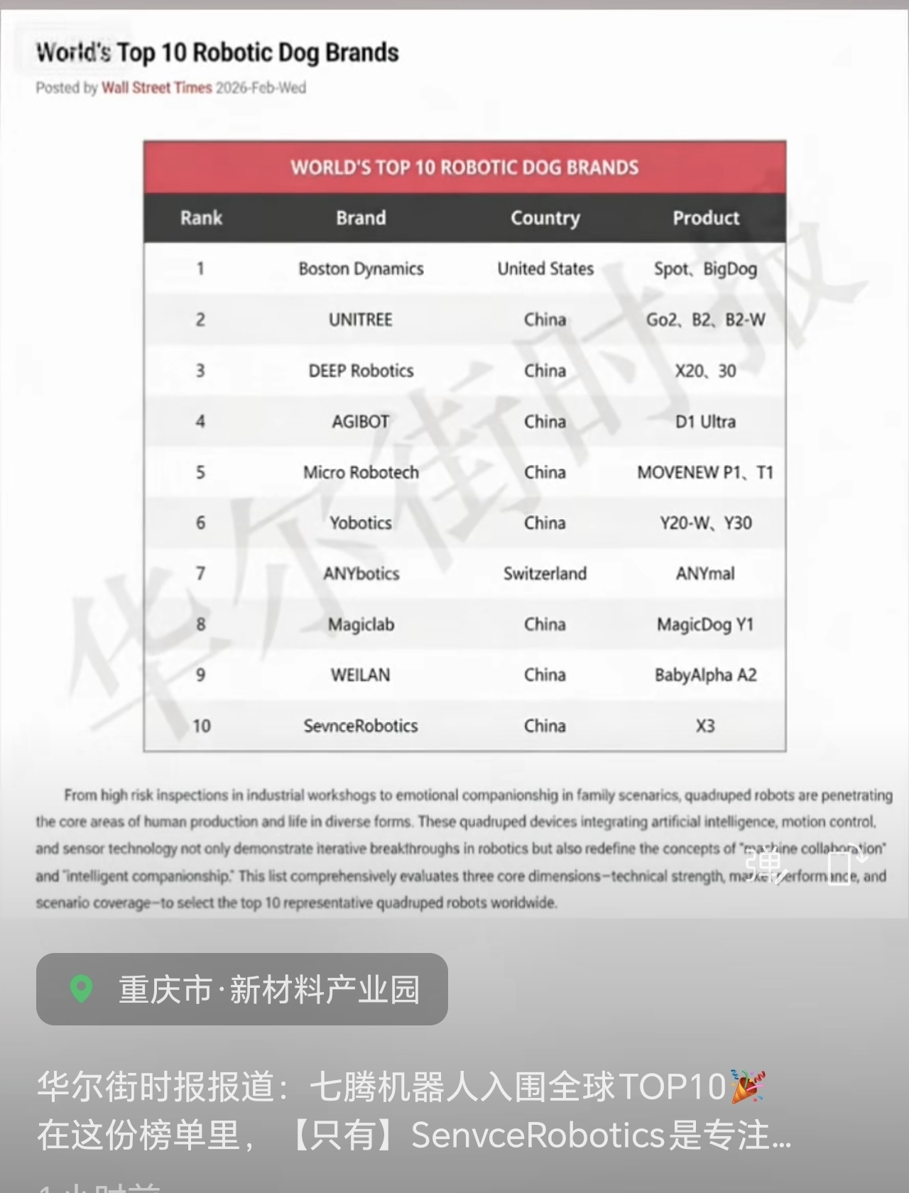 $胜通能源(SZ001331)$ 华尔街时报报道:七腾机器人入围全球TOP10[庆祝]在这份榜单里,【只有】SenvceRobotics是专注做【防爆巡检】的,而且是【全球首款】量产防爆四足机器人的厂商。#七腾机器人 #防爆 #化工 #华尔街 #全球
