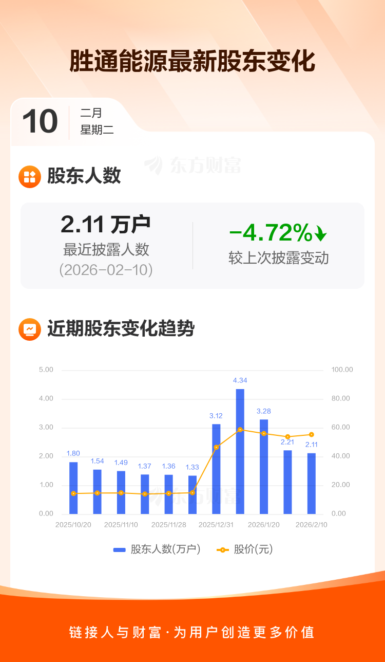 胜通能源:截至2月10日最新股东户数2.11万户,较上期减少4.72%