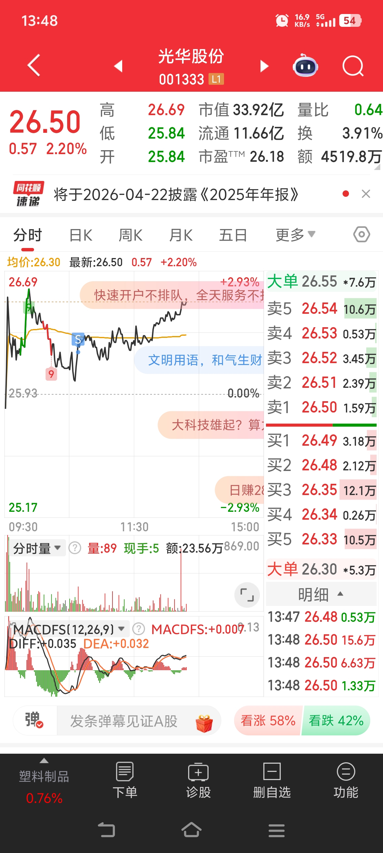 $光华股份(SZ001333)$ 早上大盘跌成那样实在熬不住卖了,你又起来了