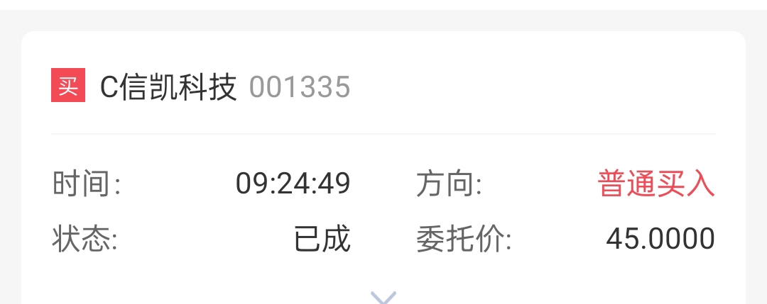 $C信凯(SZ001335)$ 买了小玩一下,我直接打的45,开盘价成交了44.69