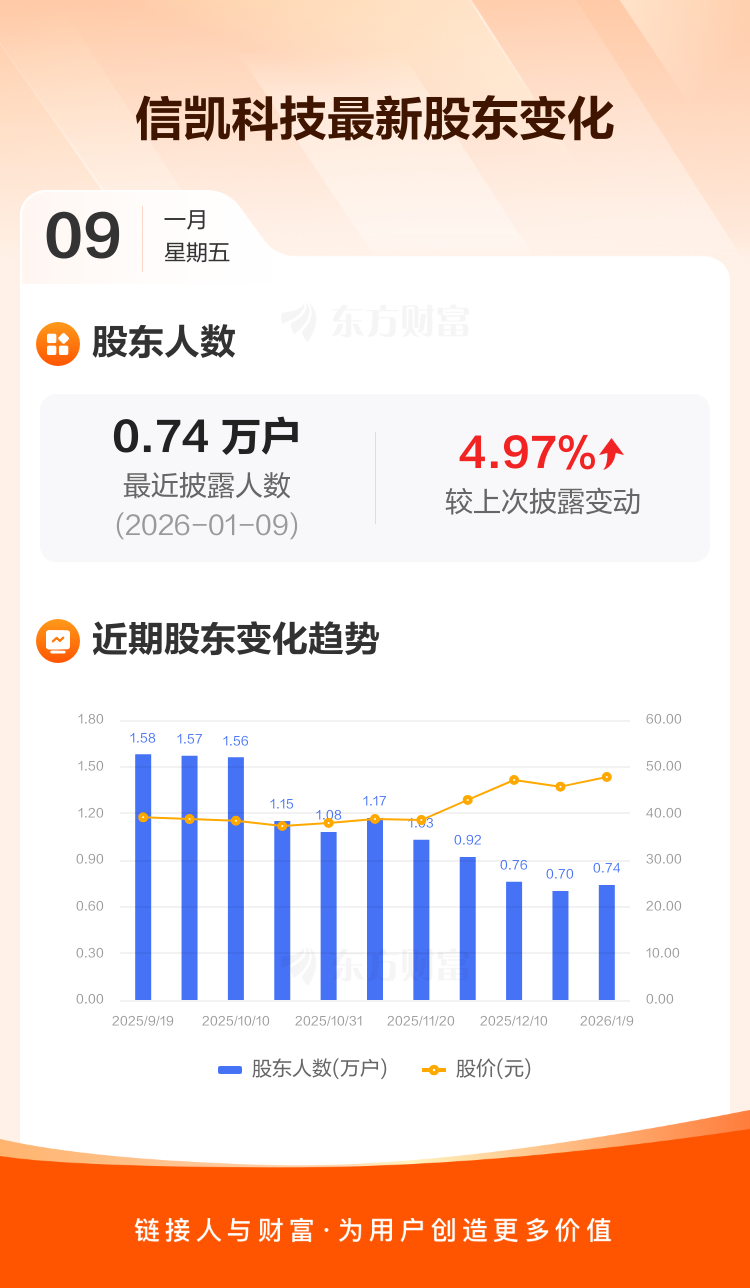 信凯科技:截至1月9日最新股东户数7378户,较上期增加4.97%