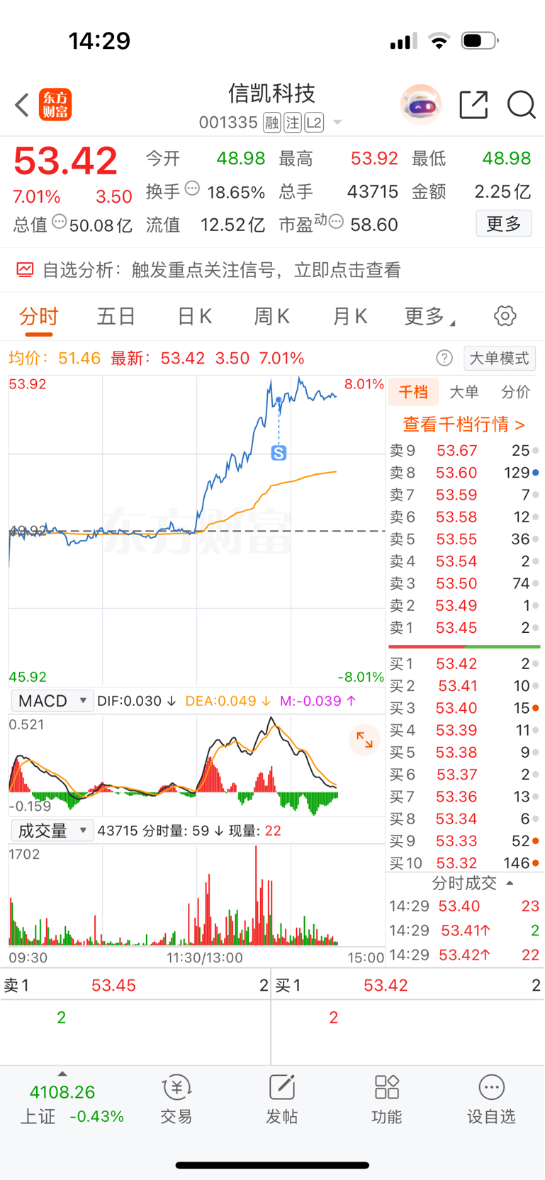 $信凯科技(SZ001335)$ 今天没直接拉涨停就是骗炮,卖了止盈,怀疑拉高出货。目标价55,最高的跑到了53.92,差不多,留下的继续发财~