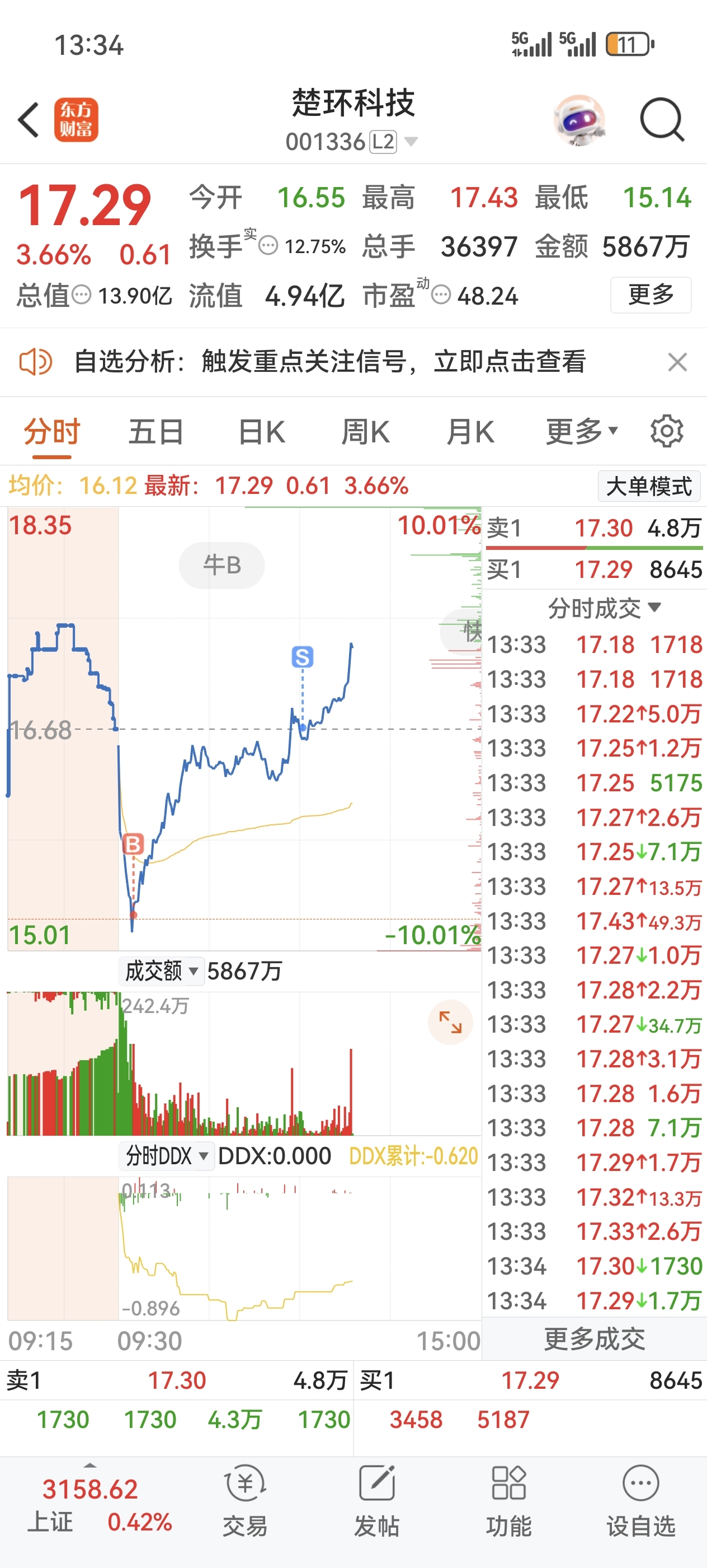 $楚环科技(SZ001336)$ 等于昨天没买 害 还说做个t