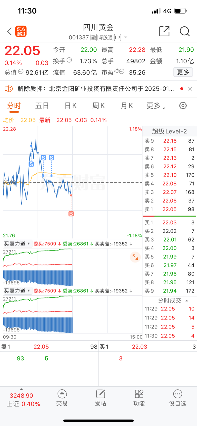 $四川黄金(SZ001337)$ 忍不住,买回来了,22.19卖的,21.96买回来,再跌再买