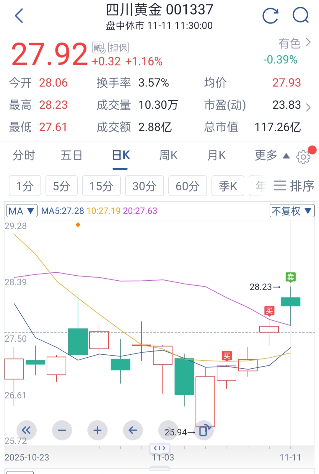 $四川黄金(SZ001337)$ 期货没力了,28.15空一下,等低了接回来