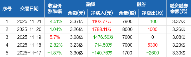融资方面,当日融资买入4234.24万元,融资偿还3131.47万元,融资净买入1102.77万元。融券方面,融券卖出0股,融券偿还100股,融券余量7900股,融券余额20.92万元。融资融券余额合计3.37亿元。