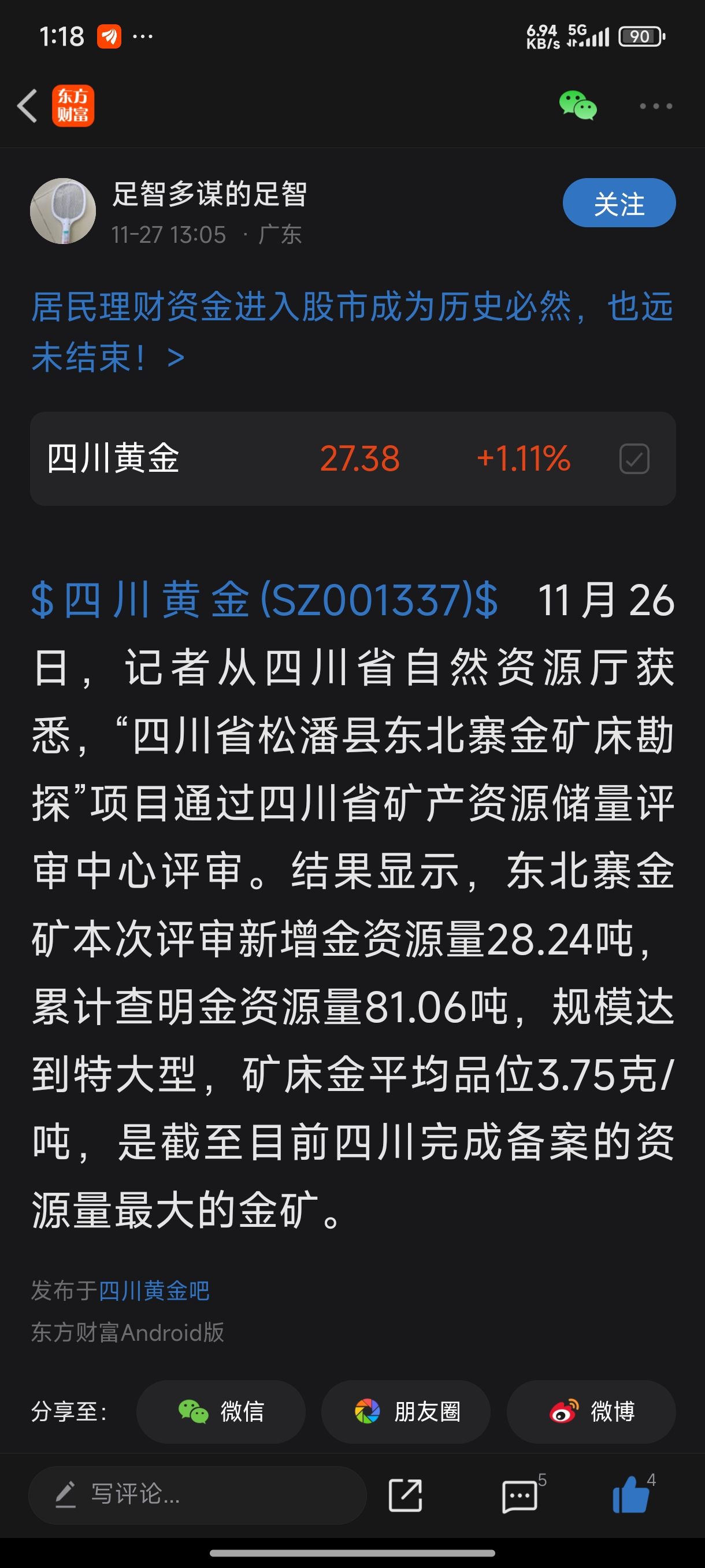 $四川黄金(SZ001337)$ 确定无悬念川娃的矿!第一二己是川国资委控股股东的!第三紫金矿业的也是川金股东!央视新闻发布!#炒股日记# #强势机会#