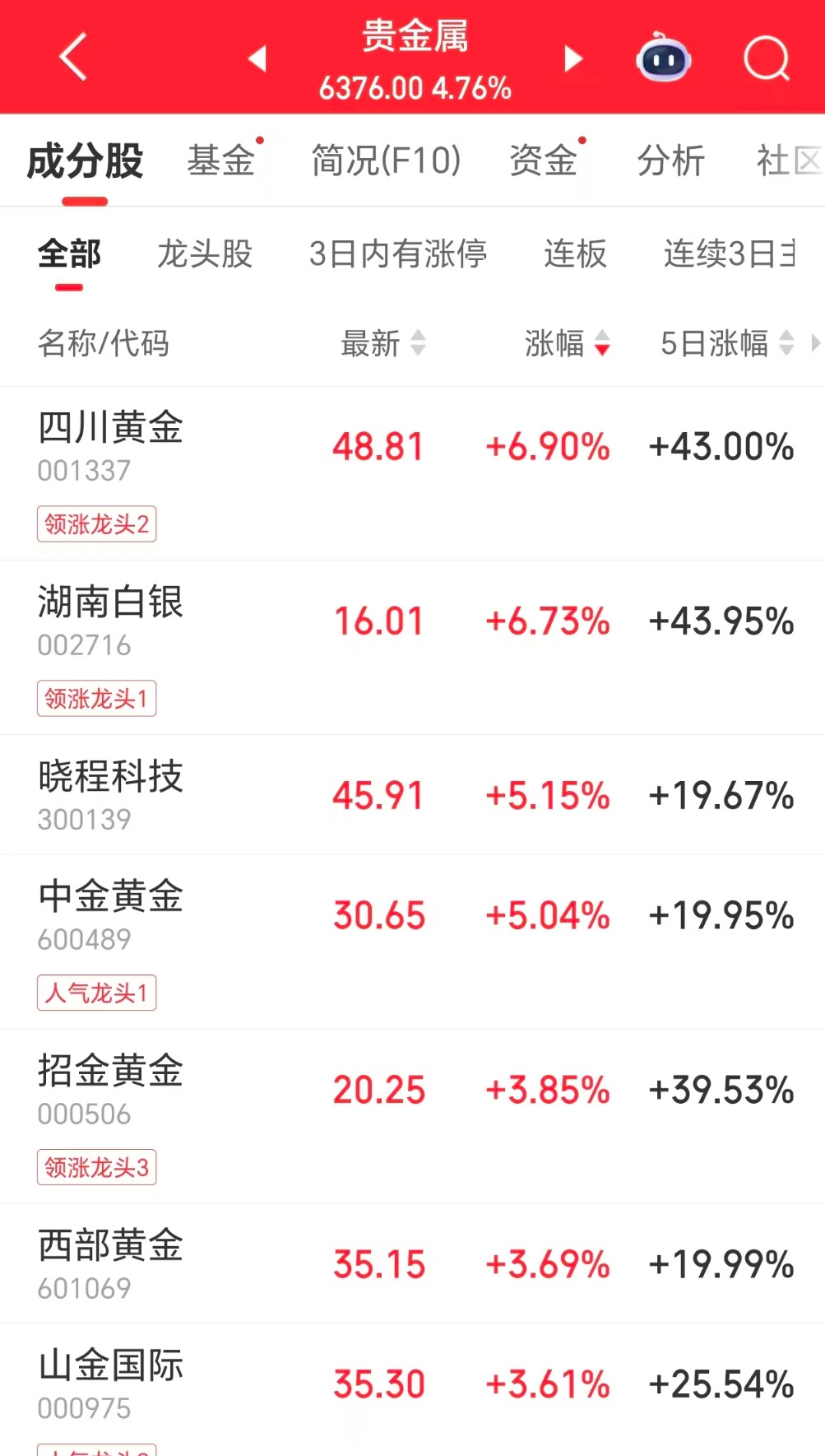 1月23日,A股贵金属板块开盘大涨。截至发稿前,四川黄金和湖南白银涨幅接近7%,晓程科技、中金黄金涨幅超过5%,招金黄金、西部黄金、山金国际等跟涨。