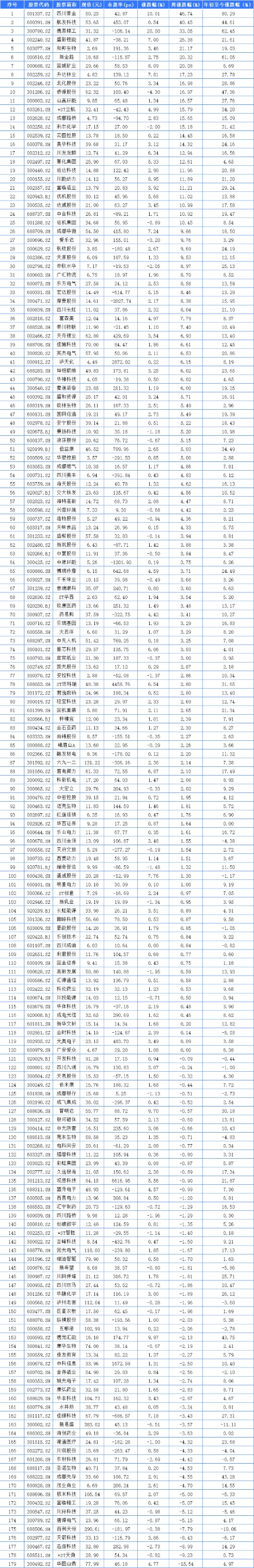 同花顺iFinD数据显示,179家四川A股,其中收涨119家,收平1家,收跌59家。