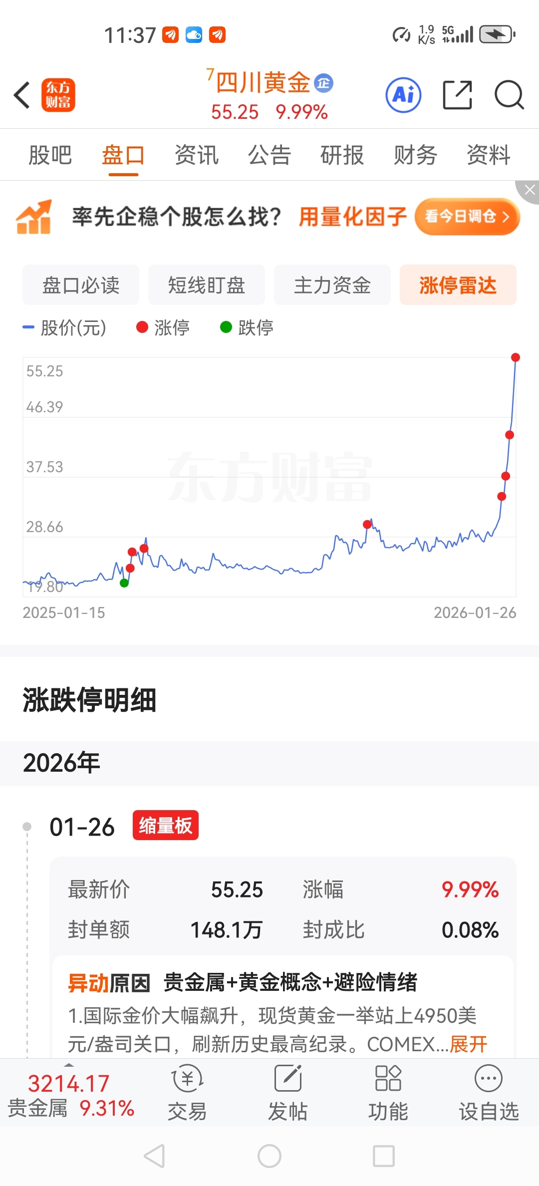 $四川黄金(SZ001337)$ $四川黄金(SZ001337)$感觉涨得差不多了连续两次跳空高开,走势这么陡峭,有可能要回调了,今天卖出2/3仓位落袋为安心里不慌,剩下200股再搏一下收益。不能过度贪心,见好就收适度即可。去年就是因为贪心,一年都白干了,交了不少学费,得长记性