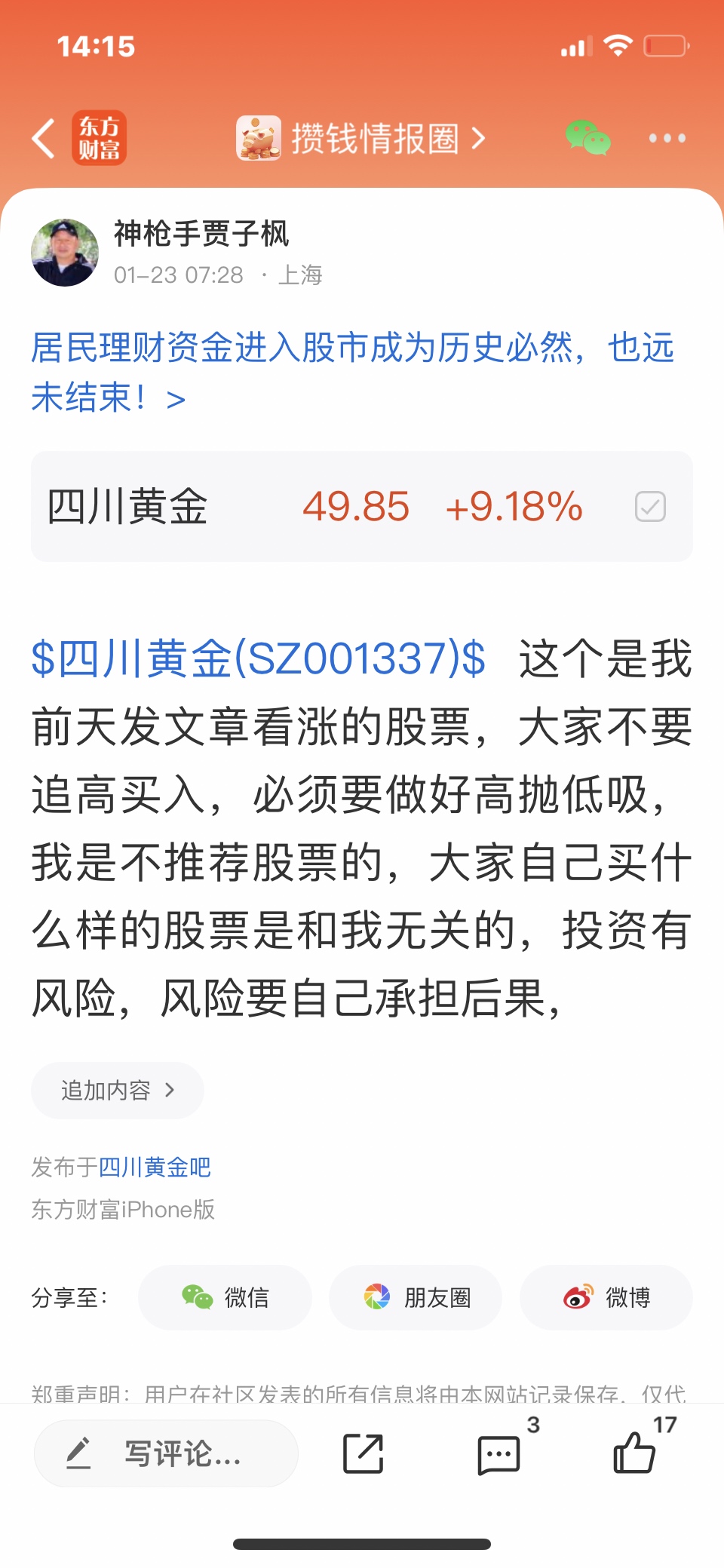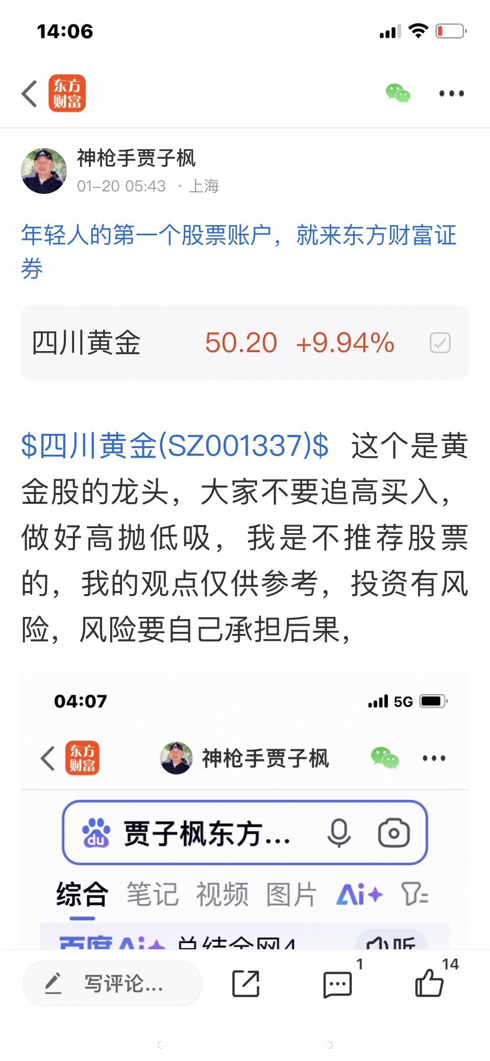 $四川黄金(SZ001337)$ 这个股我是一月十六号发表文章看涨的股票,这个股以涨幅很多了,这个价位是不可以进入的,风险是大于收益的,以前有这个股的要做好高抛低吸,我是不推荐股票的,大家自己买什么样的股票是和我无关的,我是免费和大家一起交流股票,我是和大家一起学习的,我的观点仅供参考,不构成任何投资建议,投资有风险,风险要自己承担后果,